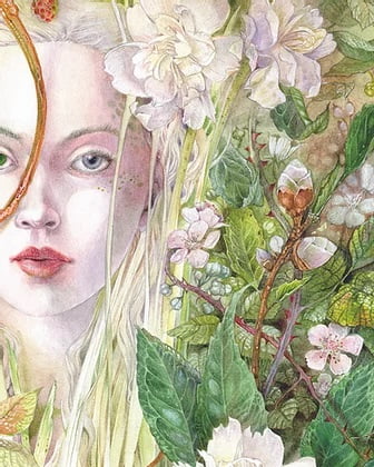Stephanie Law is an American painter and illustrator. Growing up in California, Law has built a basis from the natural inspiration around her, bringing the chaos and beauty found in nature’s growth into her artwork, learning how to work with organic textures and patterns. Law also integrates her experience as a dancer, fusing the natural movements of the human body to bring life to every aspect of her paintings. Interweaving, watercolor, ink, and metallic leaf, Law creates intricate layered pieces that display a blend of organic patterns and familiar archetypes. Law’s paintings aim to pose a question on the nature of perception and beauty, and Law explores this question with the “ephemeral guides and strange creatures” that populate her work.