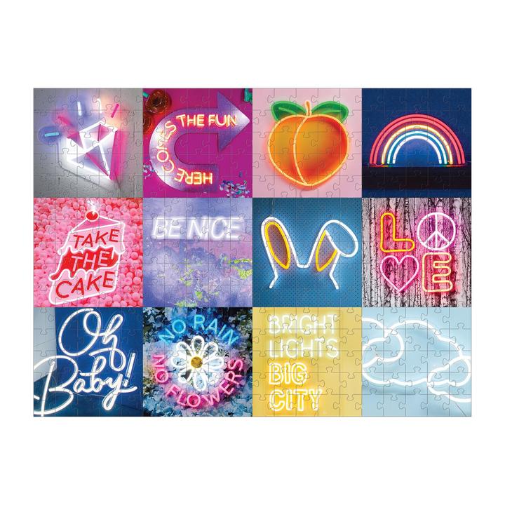 The Electric Confetti 300 Piece Puzzle from Galison features a grid of 12 images of neon signs from Electric Confetti, a world-leading specialist LED neon design located in Melbourne, Australia.